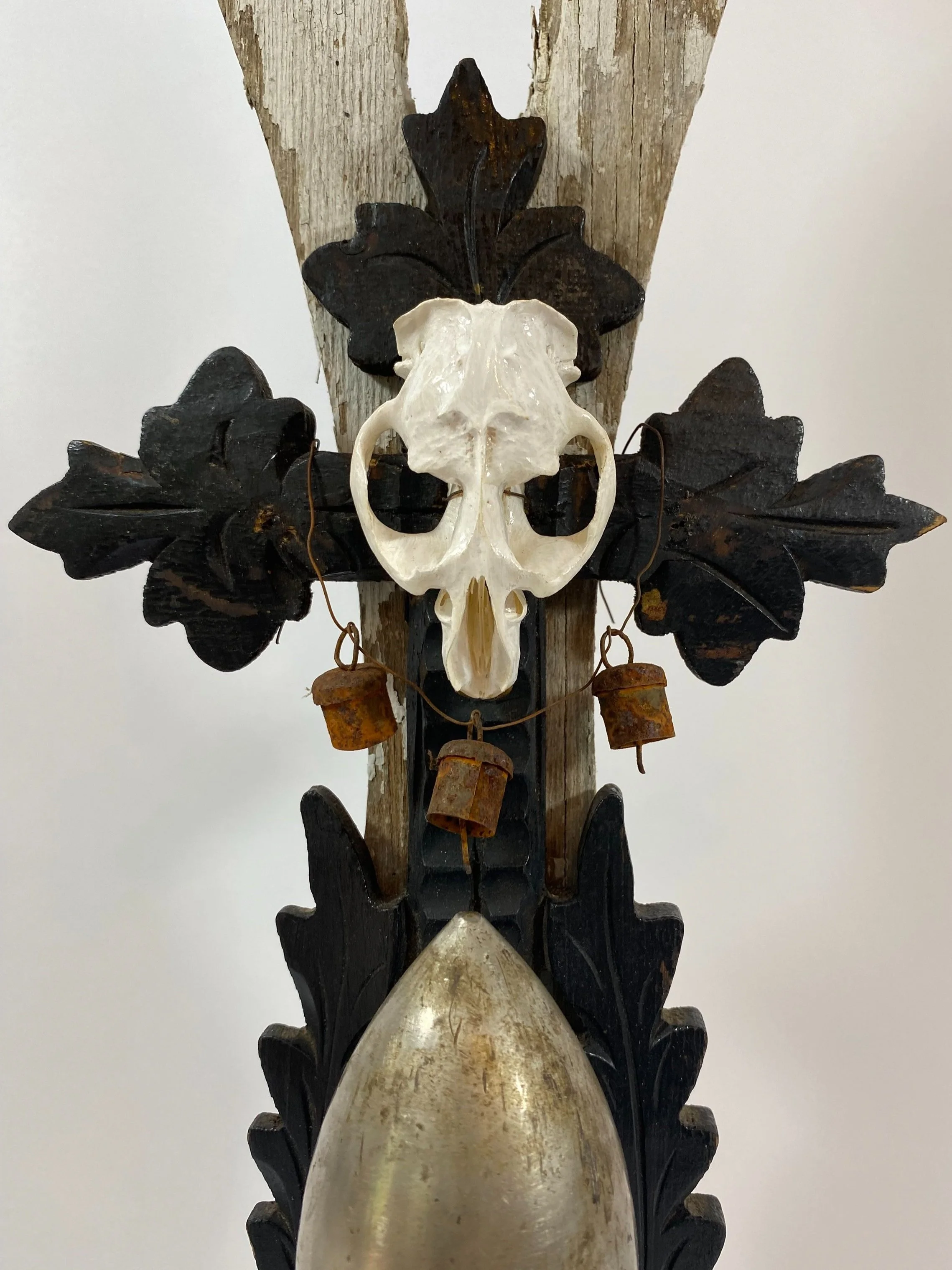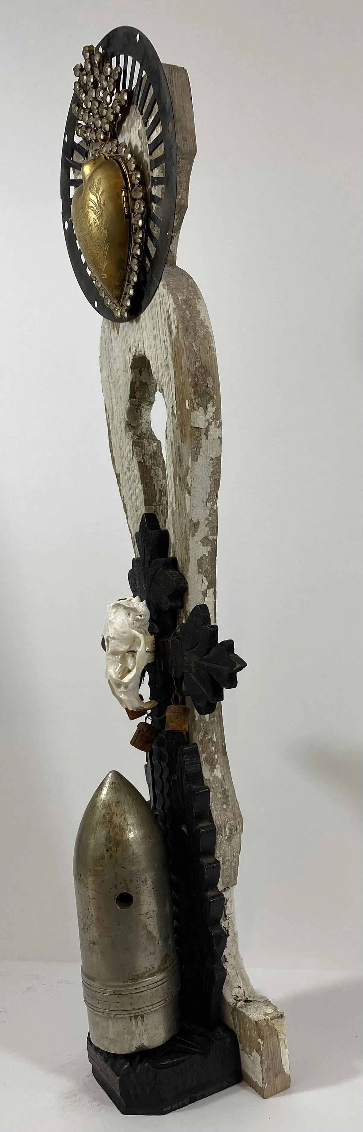 Ex-voto sacred heart cachette locket, recycled metal gear, 19th century French Napoleon III ebony crucifix, WW2 artillery projectile, Victorian-era porch baluster, muskrat skull.