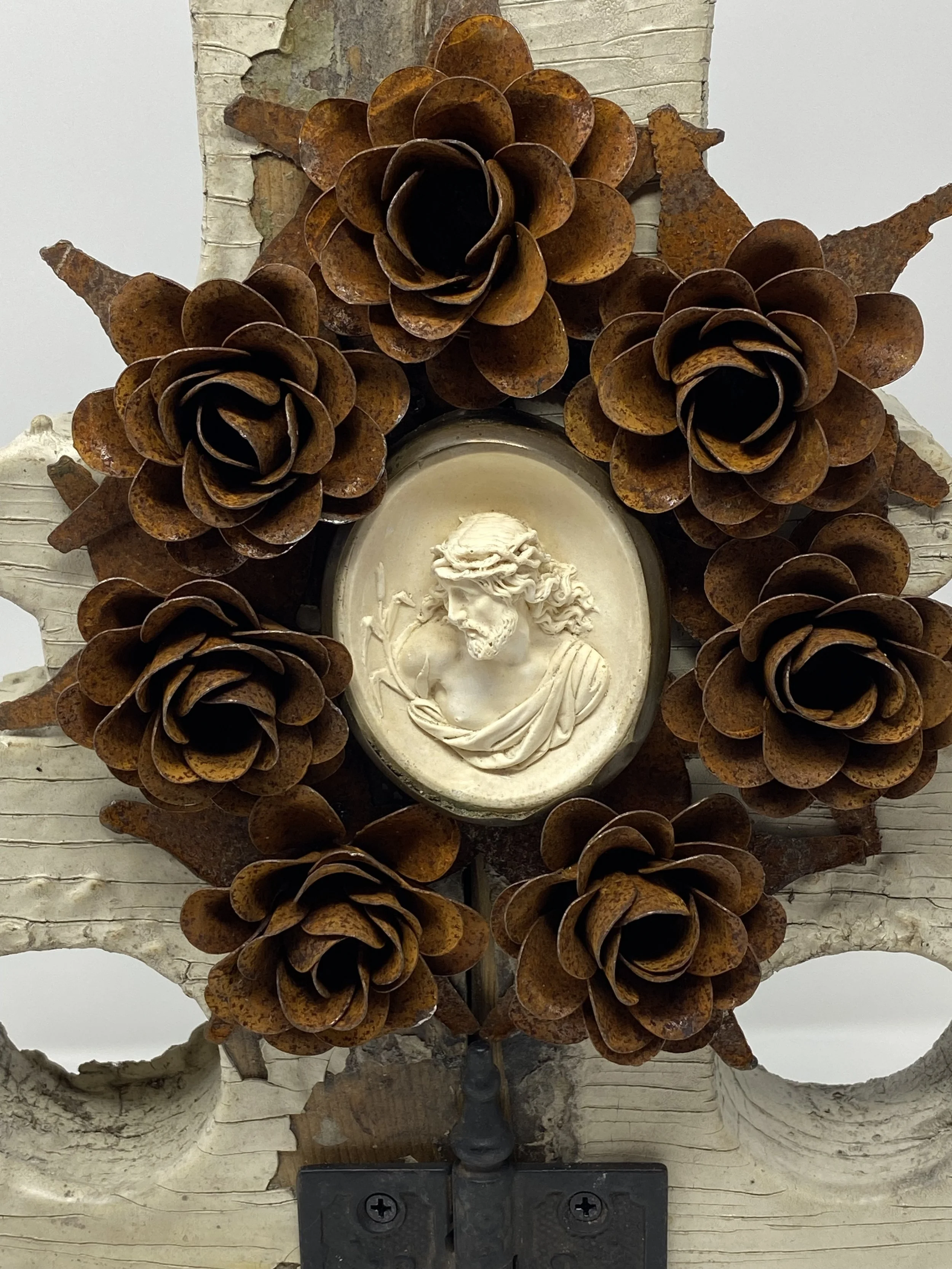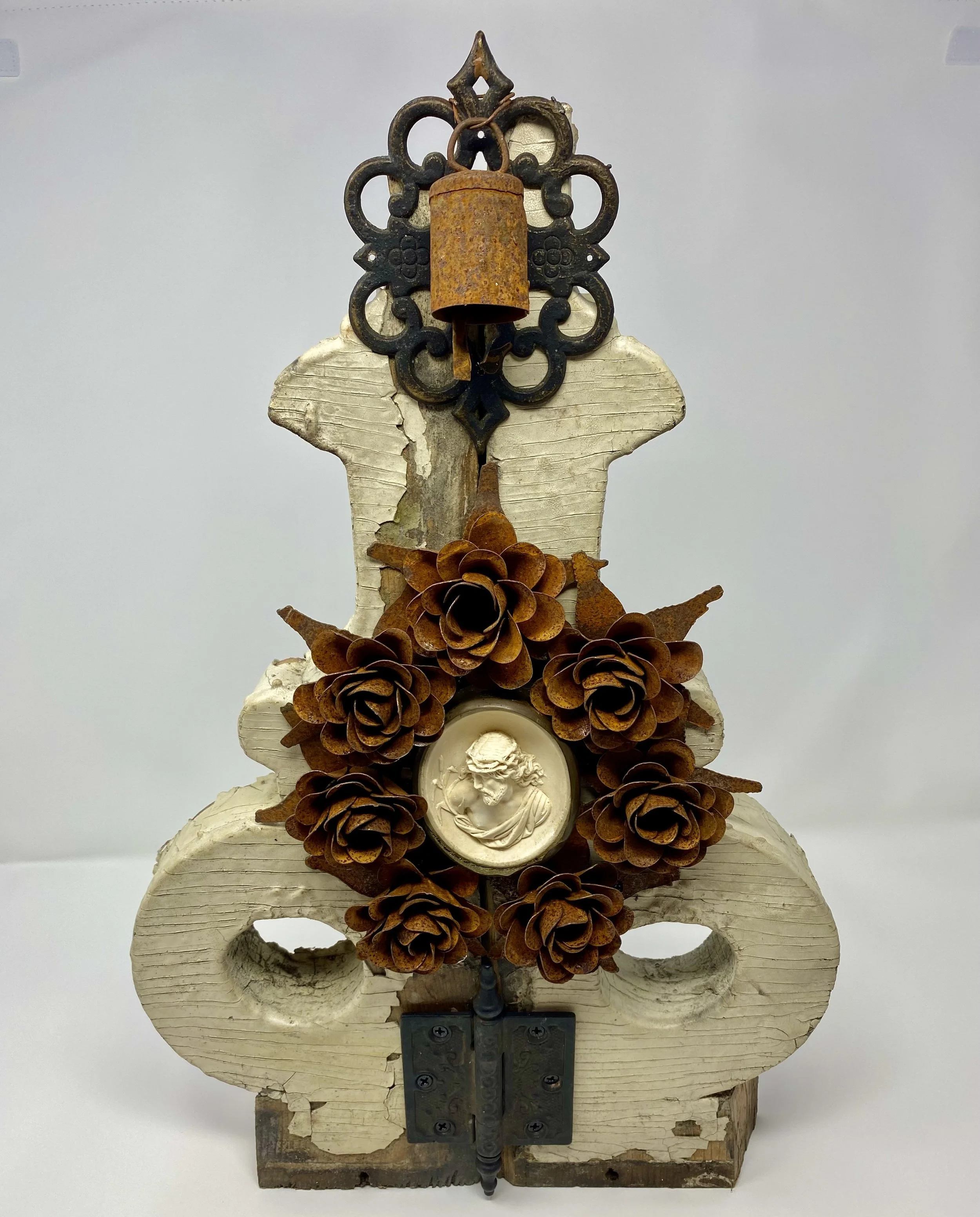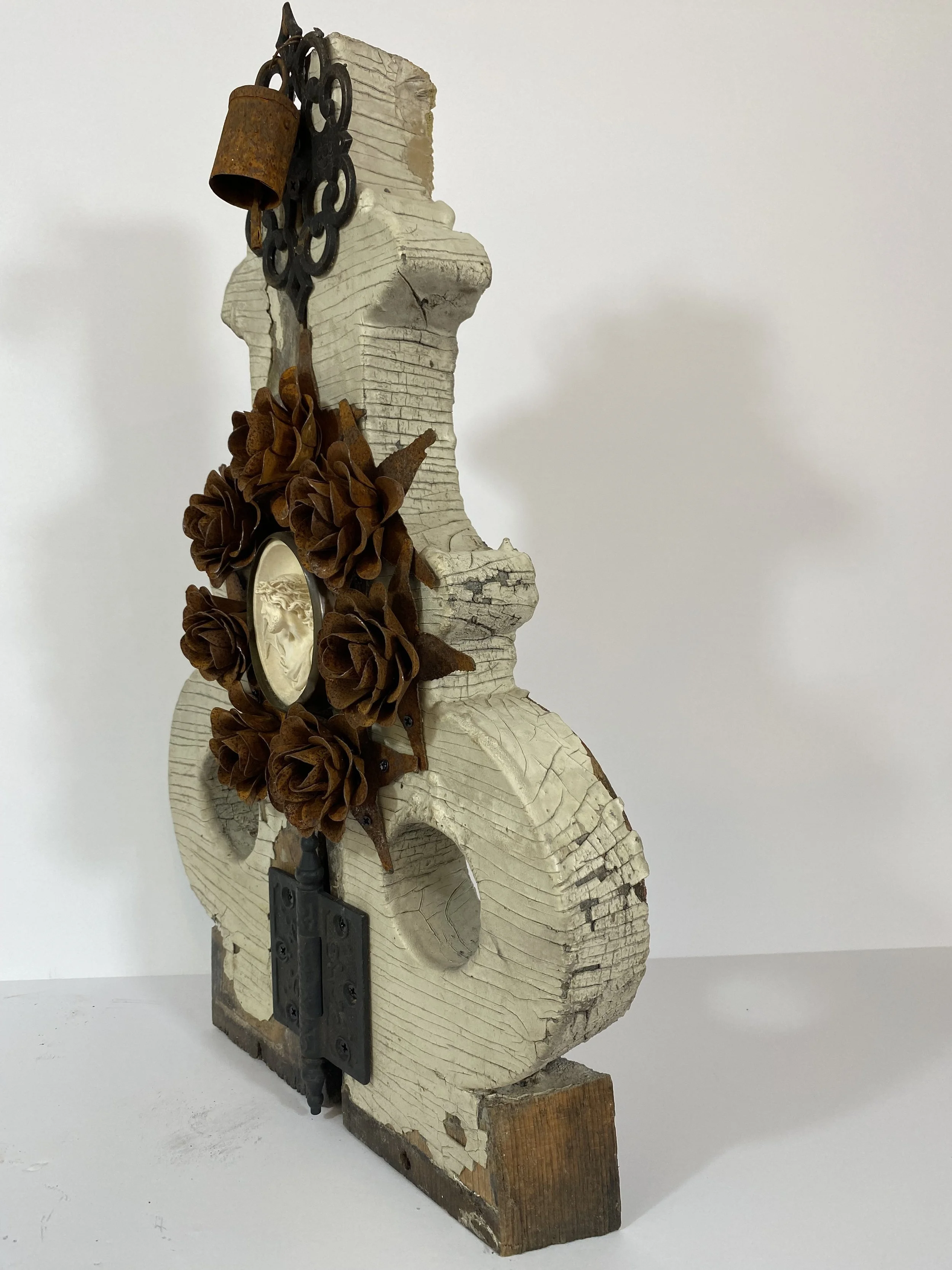 19th century Malaga, Spain meerschaum carving, Victorian-era farmhouse corbels, vintage hinge, rusty metal roses, vintage metal plate, vintage India cow bell.