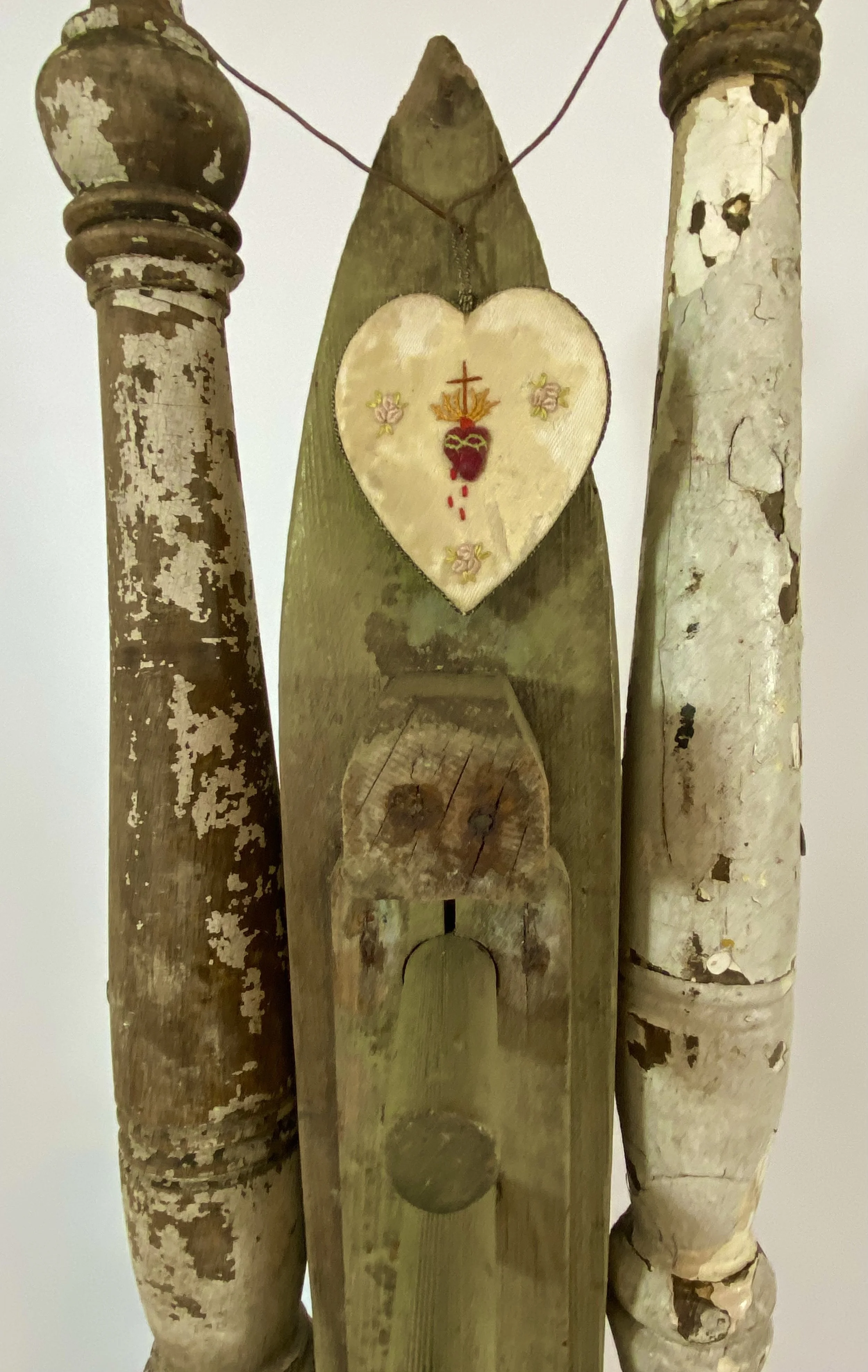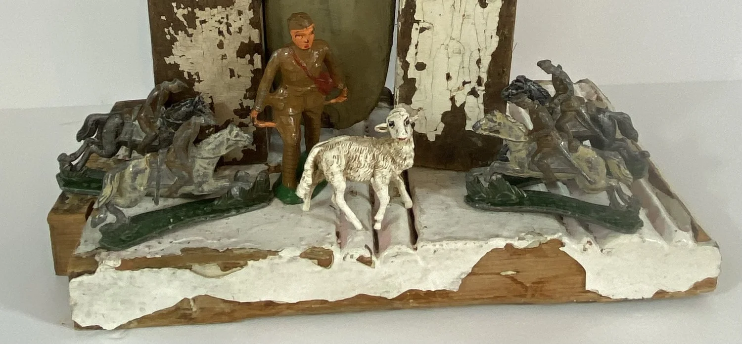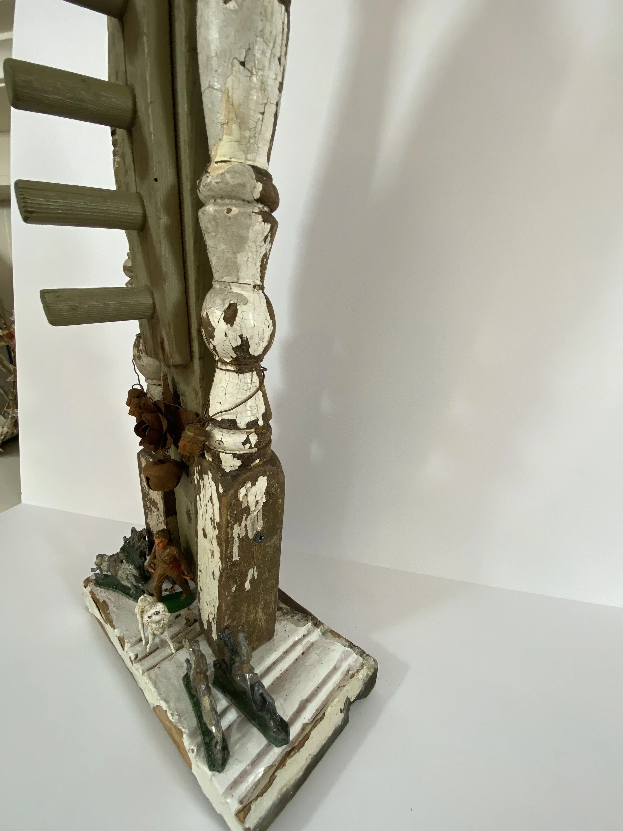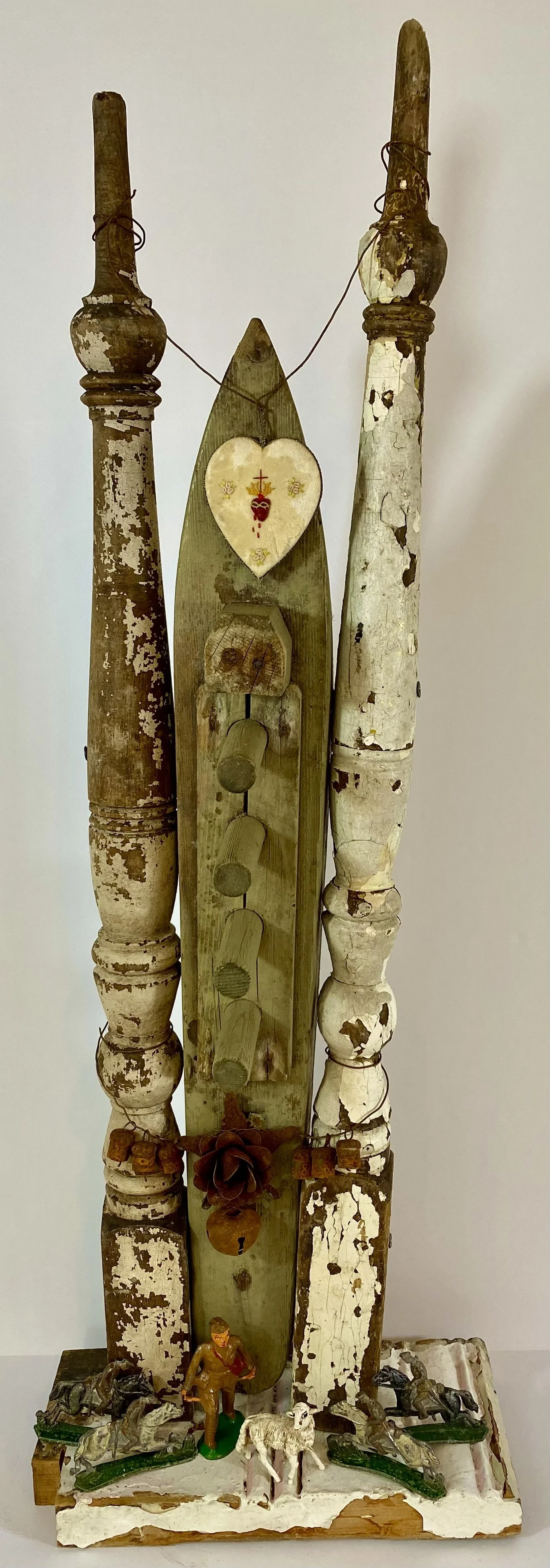 Antique U.S. Navy four stack 1920s wood battleship, vintage lead toy horses, vintage 1940s Barclay Manoil lead toy soldiers, antique French embroidered Sacred Heart ex voto dated 1844, vintage Italian nativity sheep, vintage Old Virginia porch spindles.