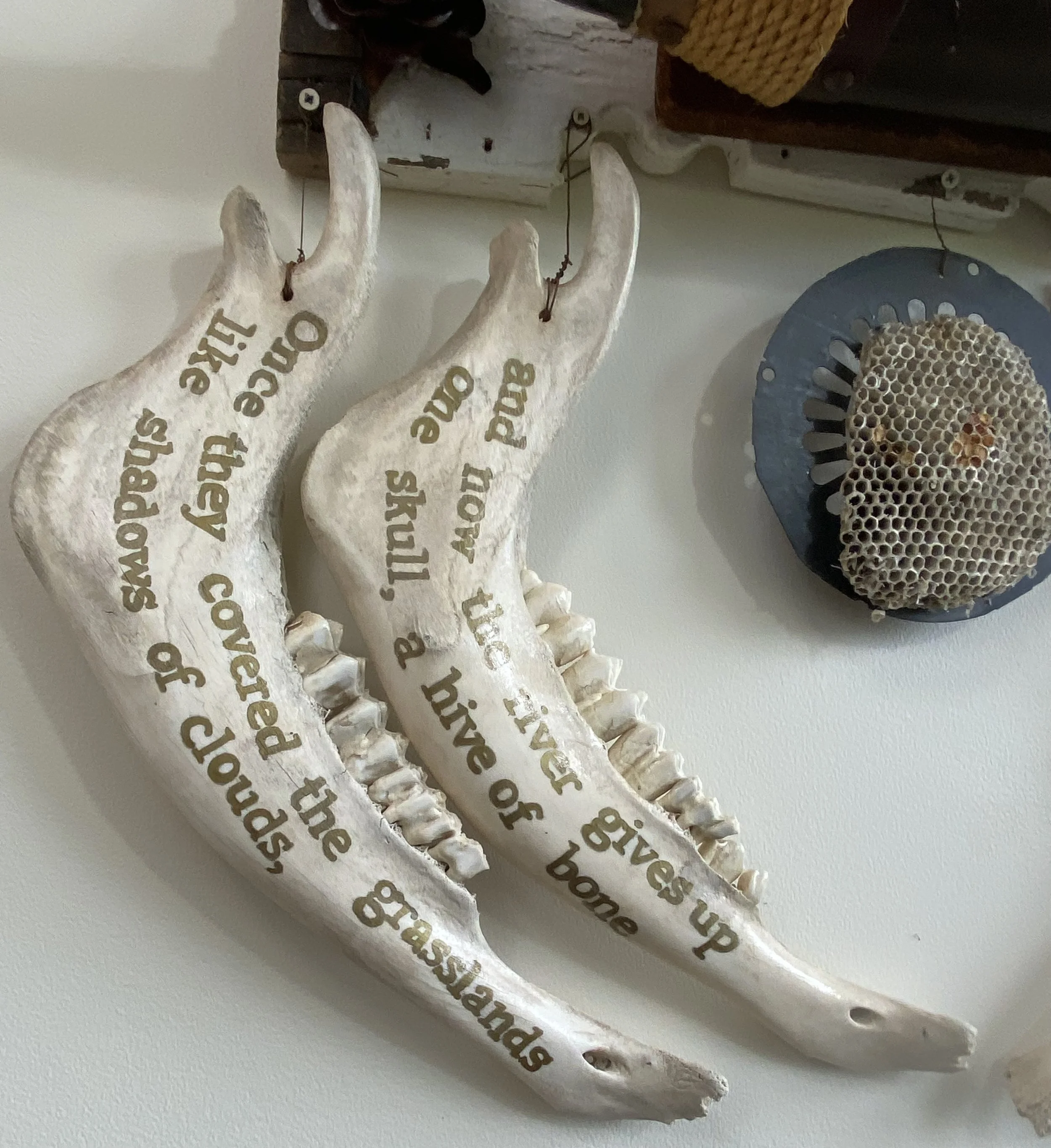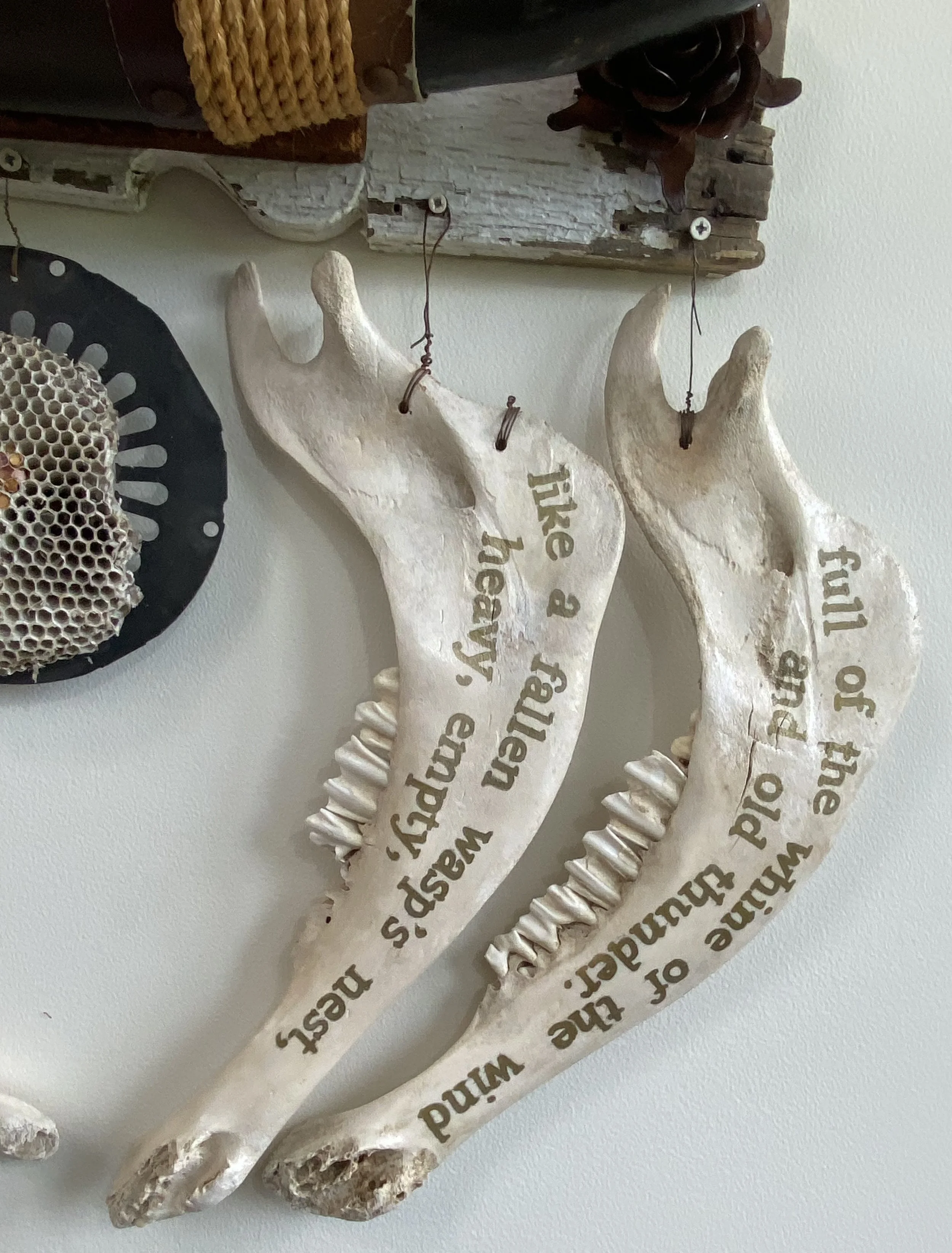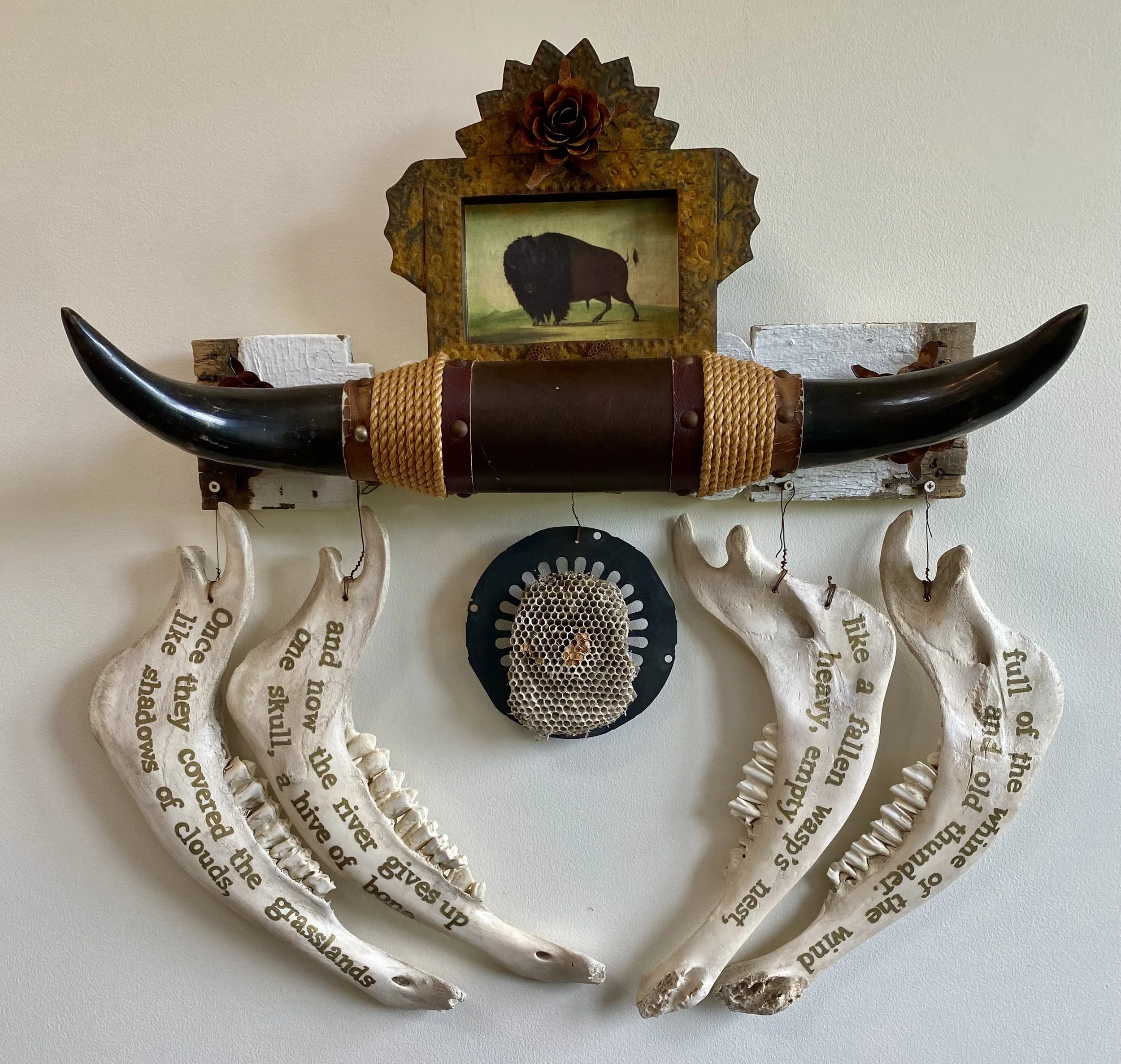 Vintage steer horns, Victorian-era porch balusters, vintage metal gear, lower buffalo jawbones, Mexican tin nichos, paper wasp nest.