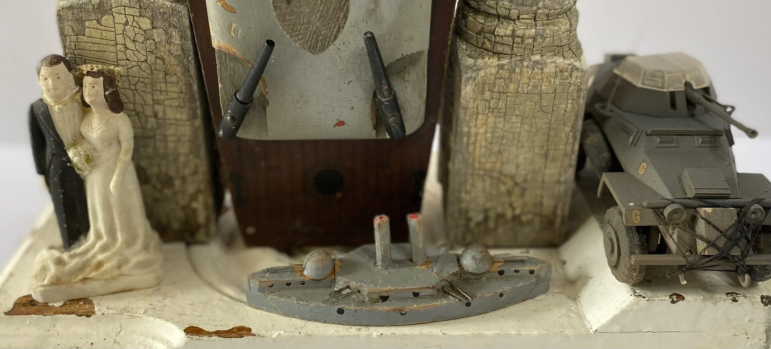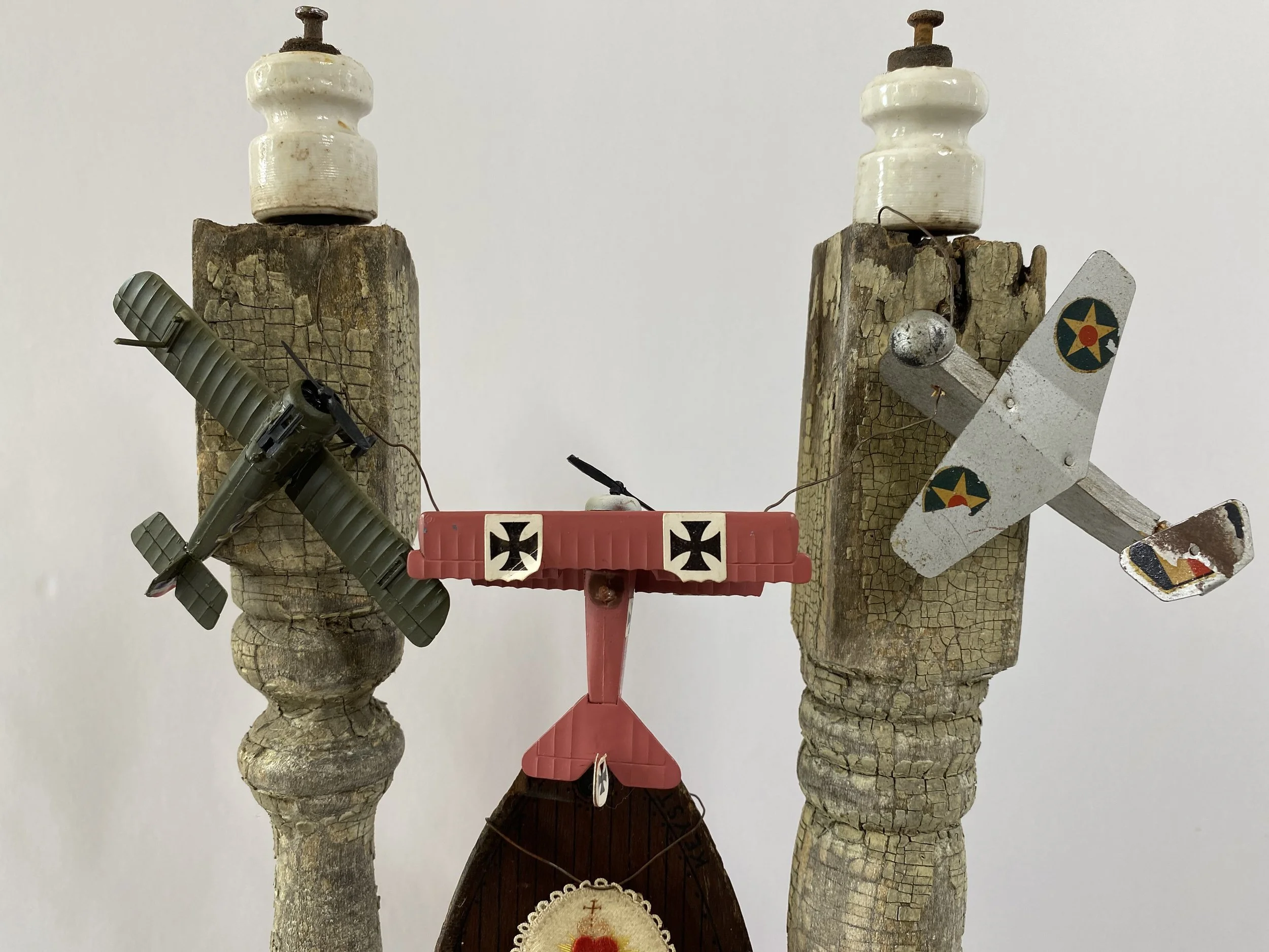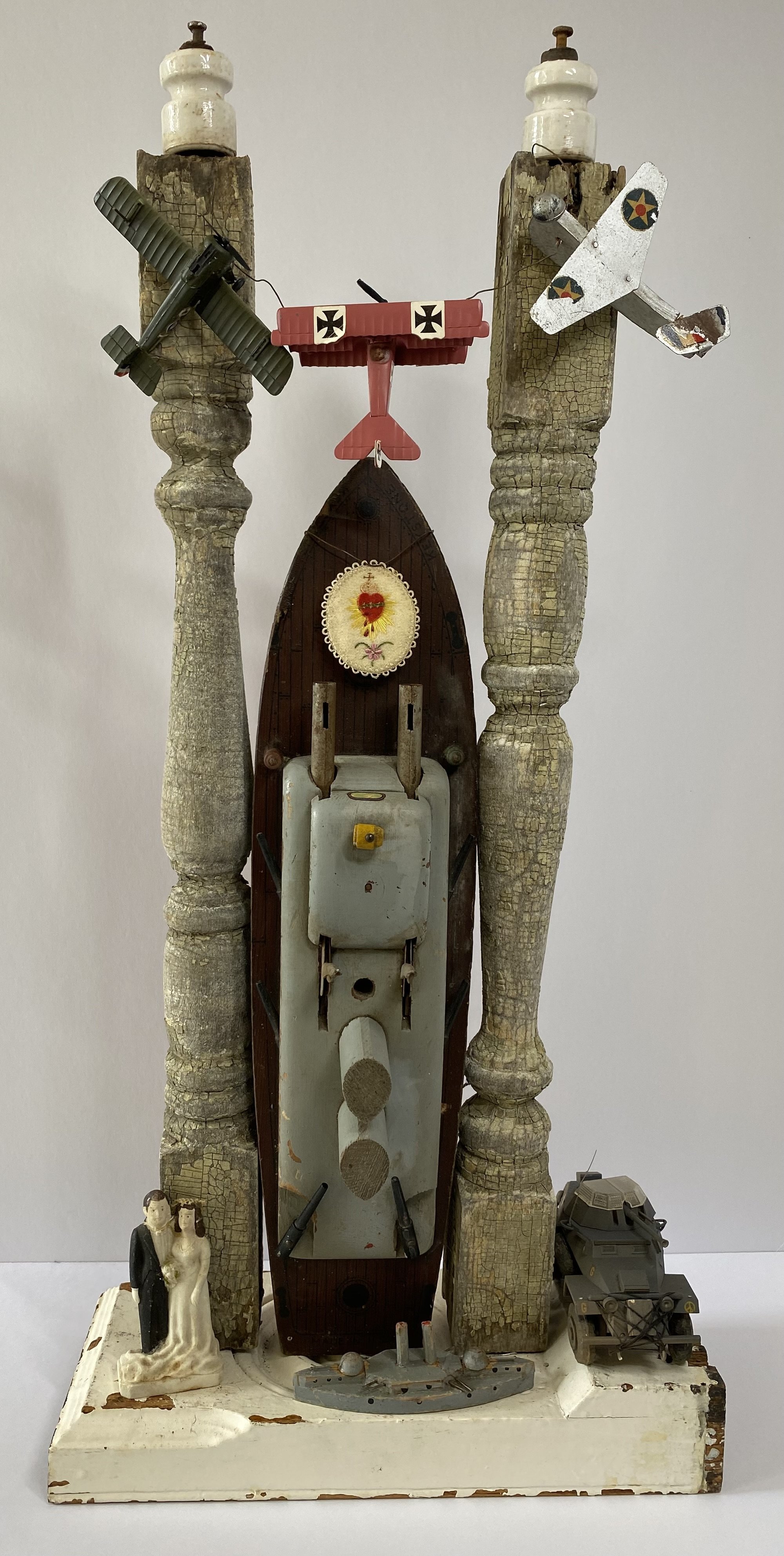 Antique ex voto embroidered scapular, 1930s bisque wedding cake topper, 1950s tin Arnold Toy Company military police Jeep, 1960s military toy airplanes, 1940s Keystone toy B-15 U.S. Battleship, vintage porcelain insulators, 1910s bullseye gouge work plinth.