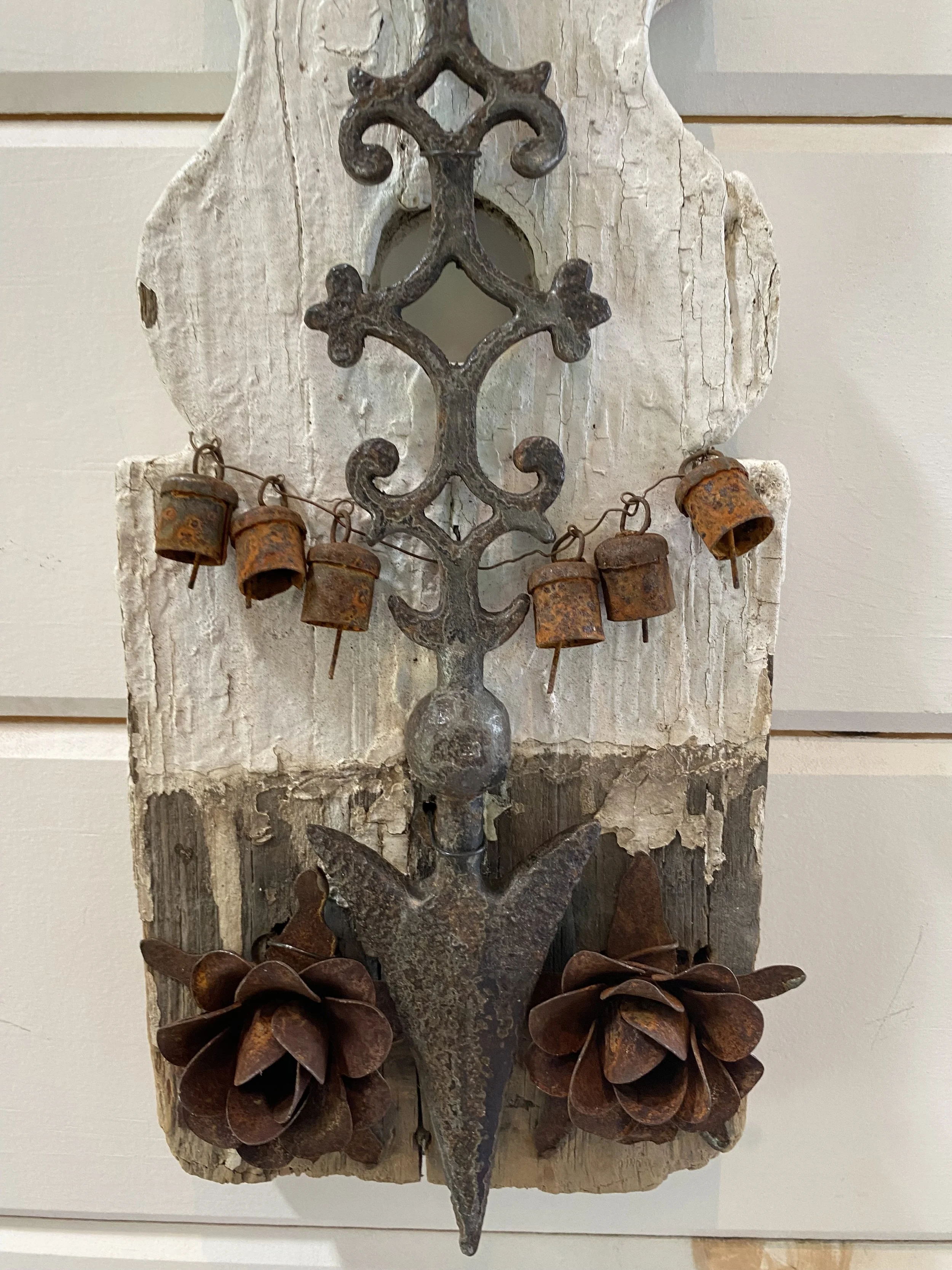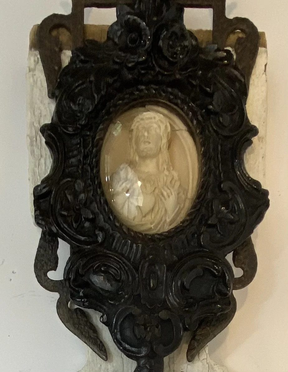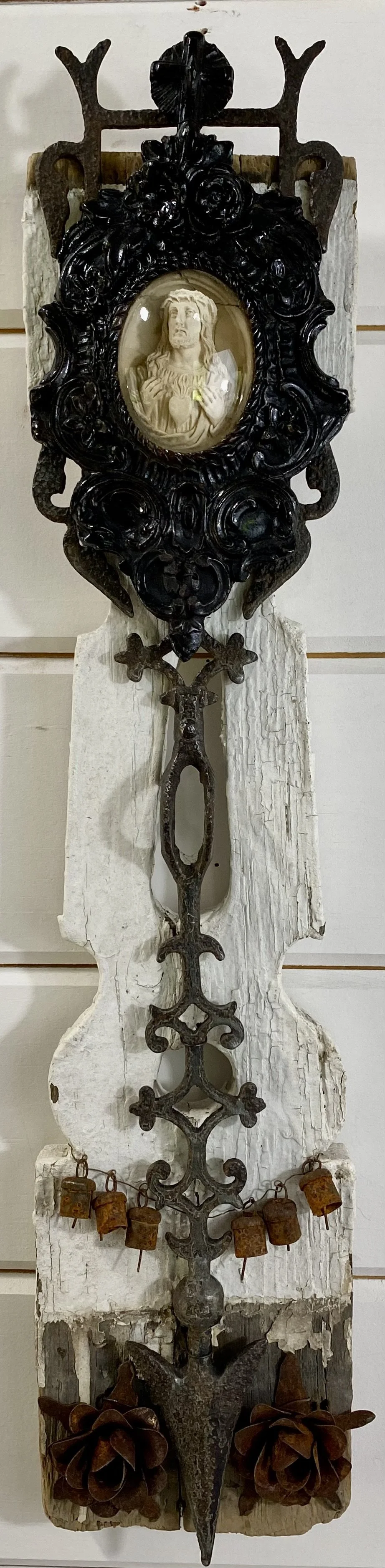 Antique 1920s lightning rod, antique French meerschaum 19th century reliquary, Victorian-era baluster, rusty vintage India cow bells.