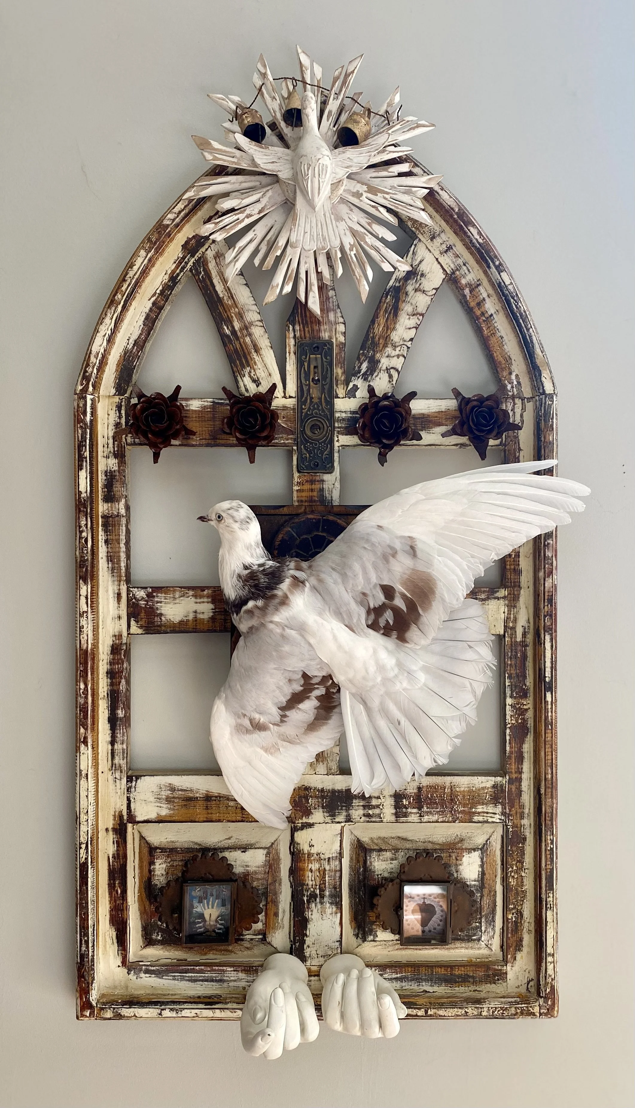 Vintage French mannequin hands, antique steel door plate, distressed window frame, Spotted Flying Rock Dove taxidermy, rusty metal roses, Mexican tin nichos, hand-carved Brazilian dove, India cow bells.