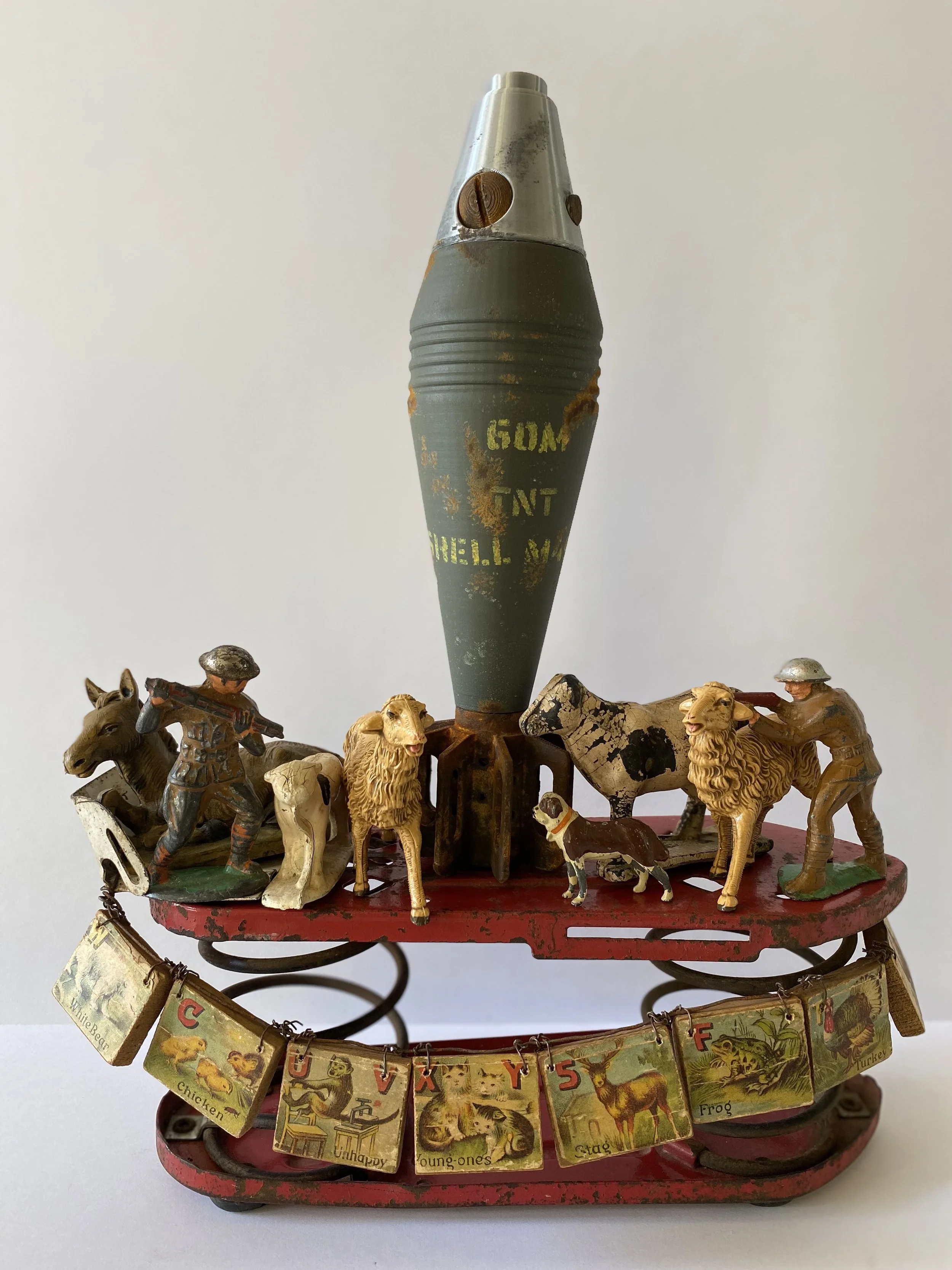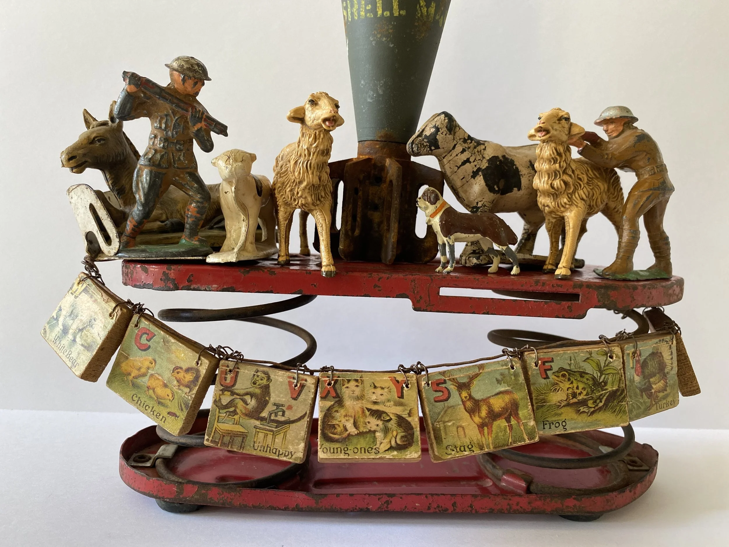 Vintage Rapco Satellite metal shoe plates with coiled springs simulating bouncing on the moon, vintage Italian nativity sheep, 1930s Britain’s Zoological Series hollow cast lead animals, 1940s cast iron Barclay Manoil toy soldiers, Vintage Victorian alphabet tiles, WW2 M49A2 mortar replica.
