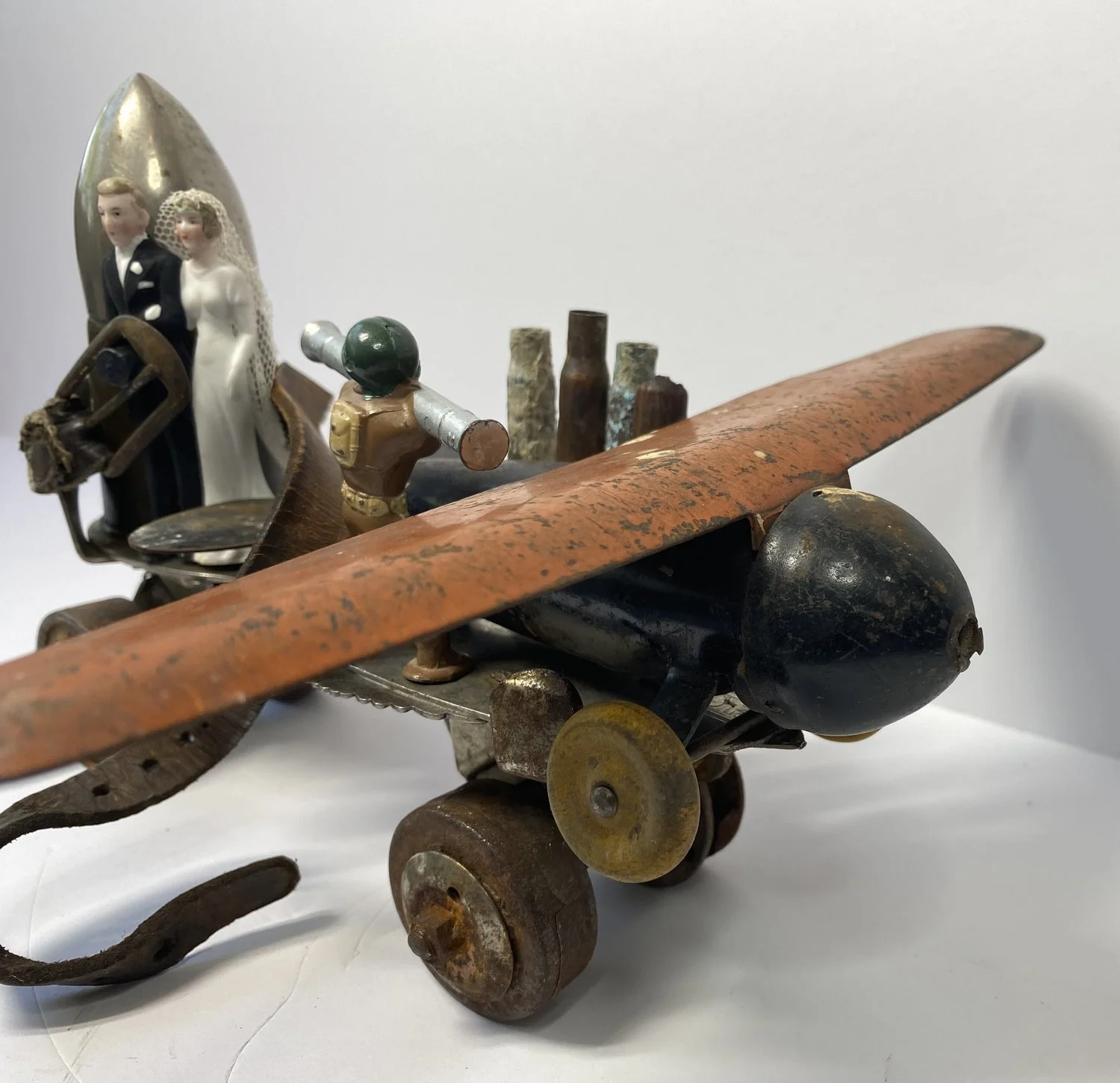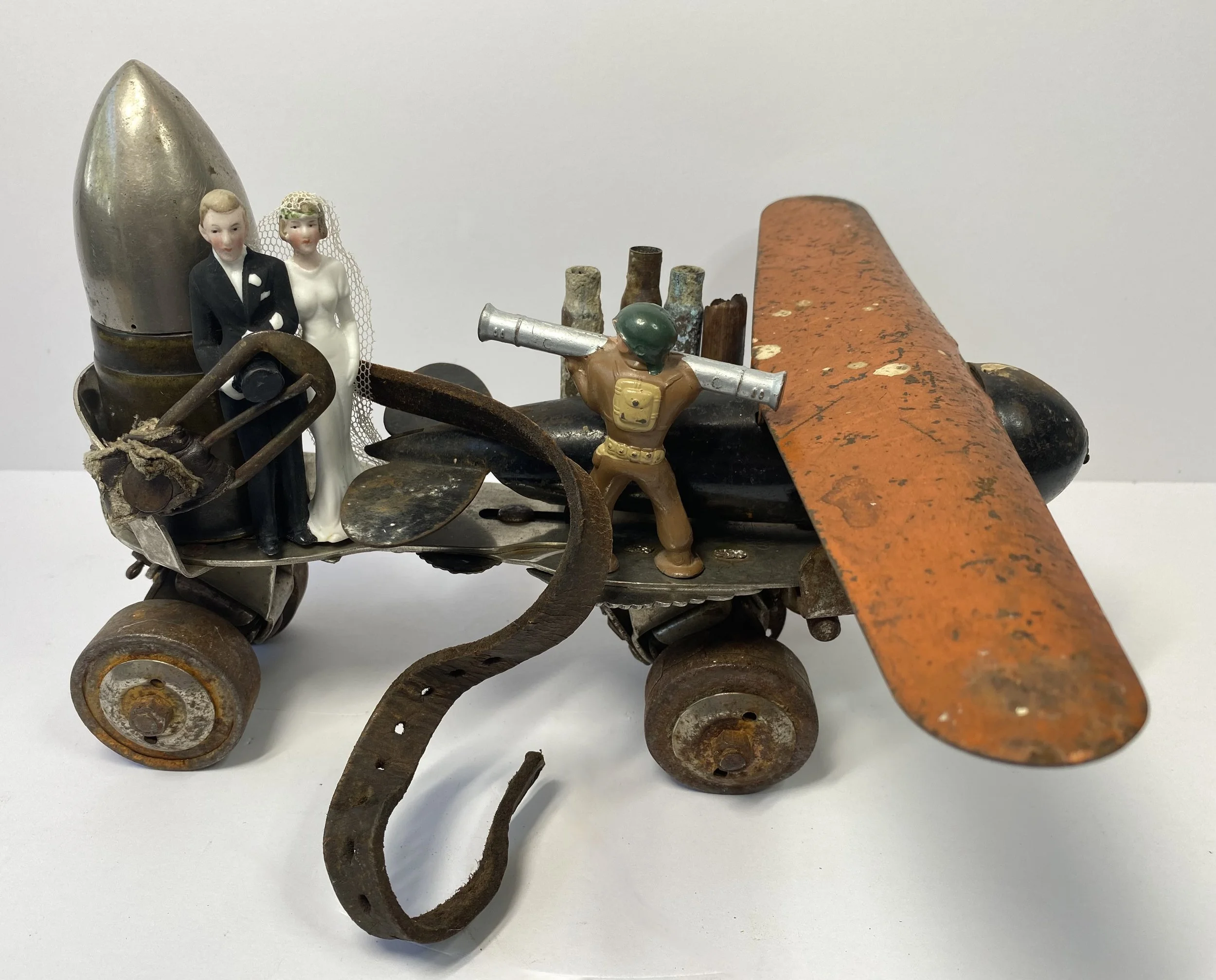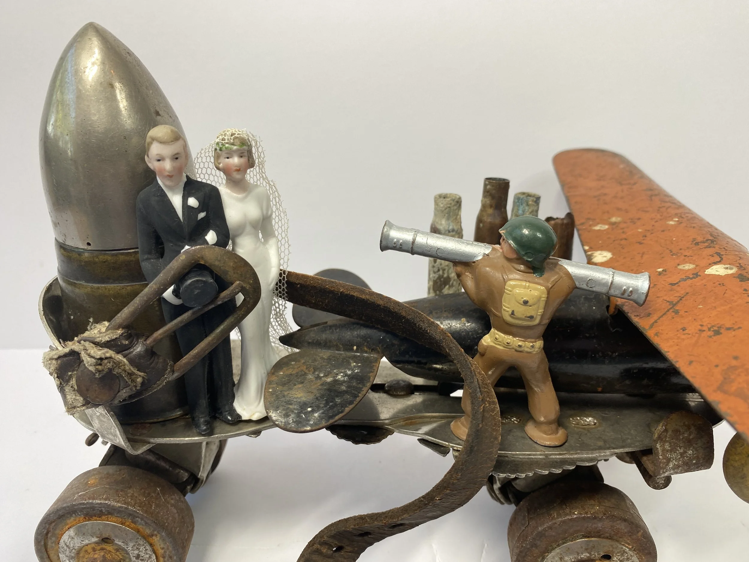 Vintage metal skates; bride and groom bisque cake topper; Barclay Manoil lead podfoot soldier; authentic shell casings from Hacksaw Ridge (Medea Escarpment) Battle of Okinawa WW2; Wyandotte metal airplane.