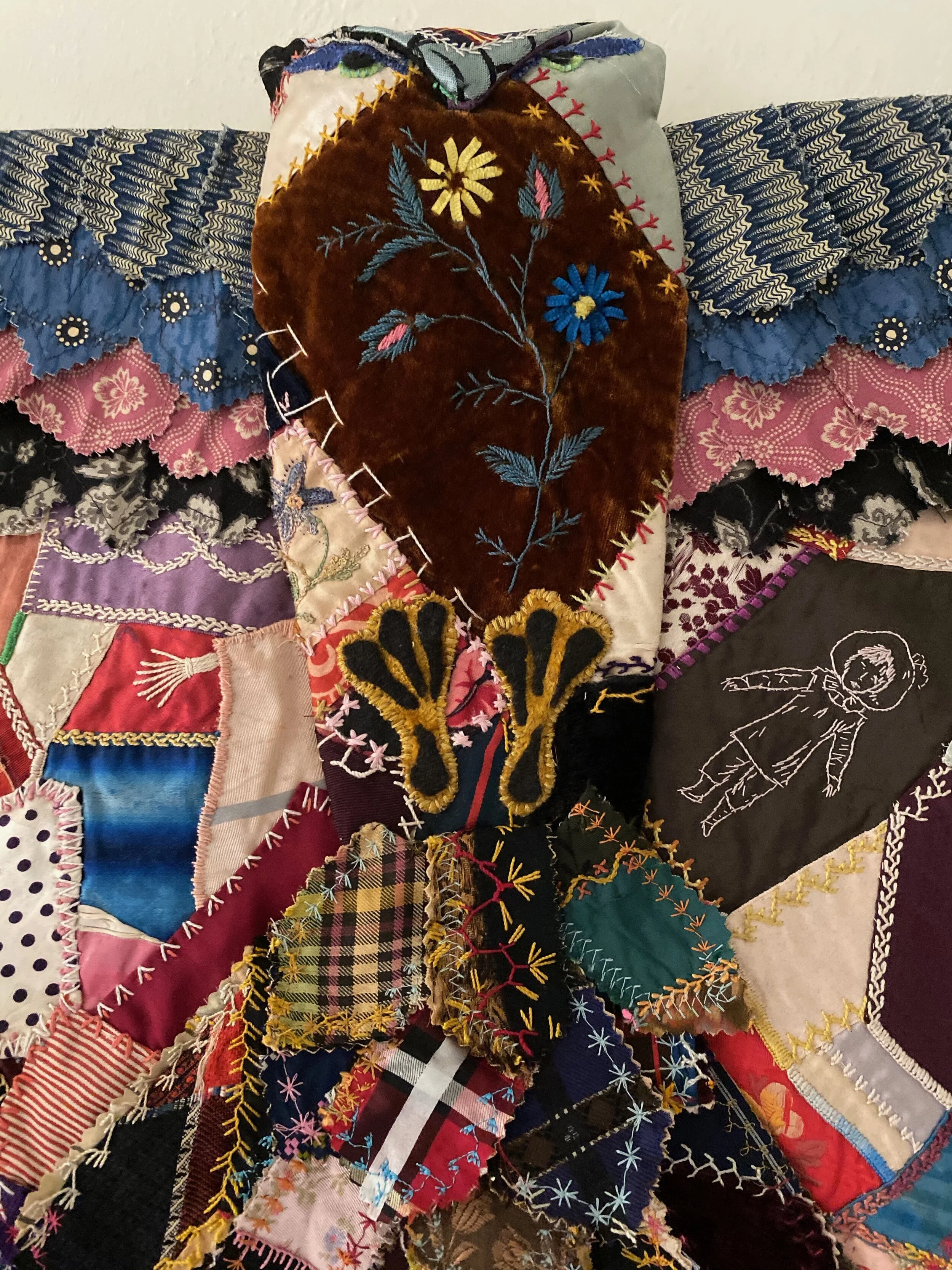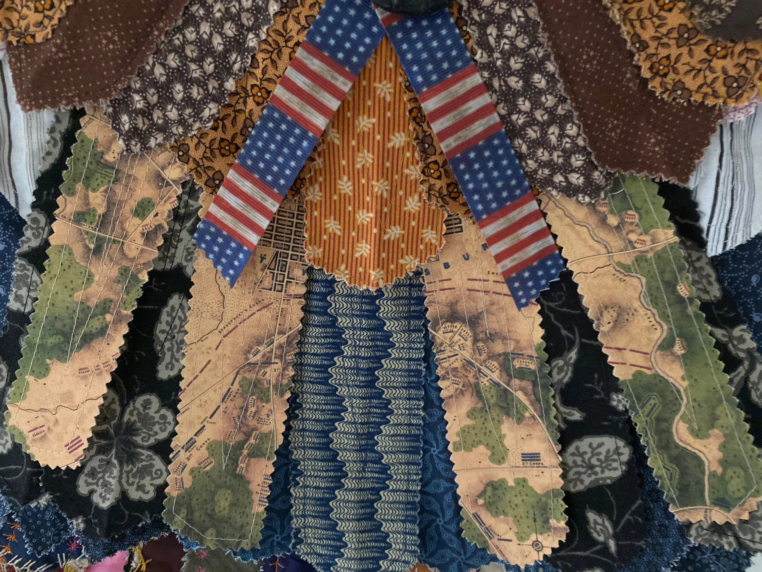 Soaring over the face of the earth, birds bear witness to both the insignificant and the incomprehensible events of human history. Gettysburg commemorates the Battle of Gettysburg in 1863 between the Union and Confederate forces. The quilt is constructed from antique striped shirting, Civil War reproduction fabrics, vintage Grandmother's Flower Garden blocks, Civil War gutta percha mourning brooch, and vintage Crazy Quilt remnants, Appliquéd, hand and machine quilted.