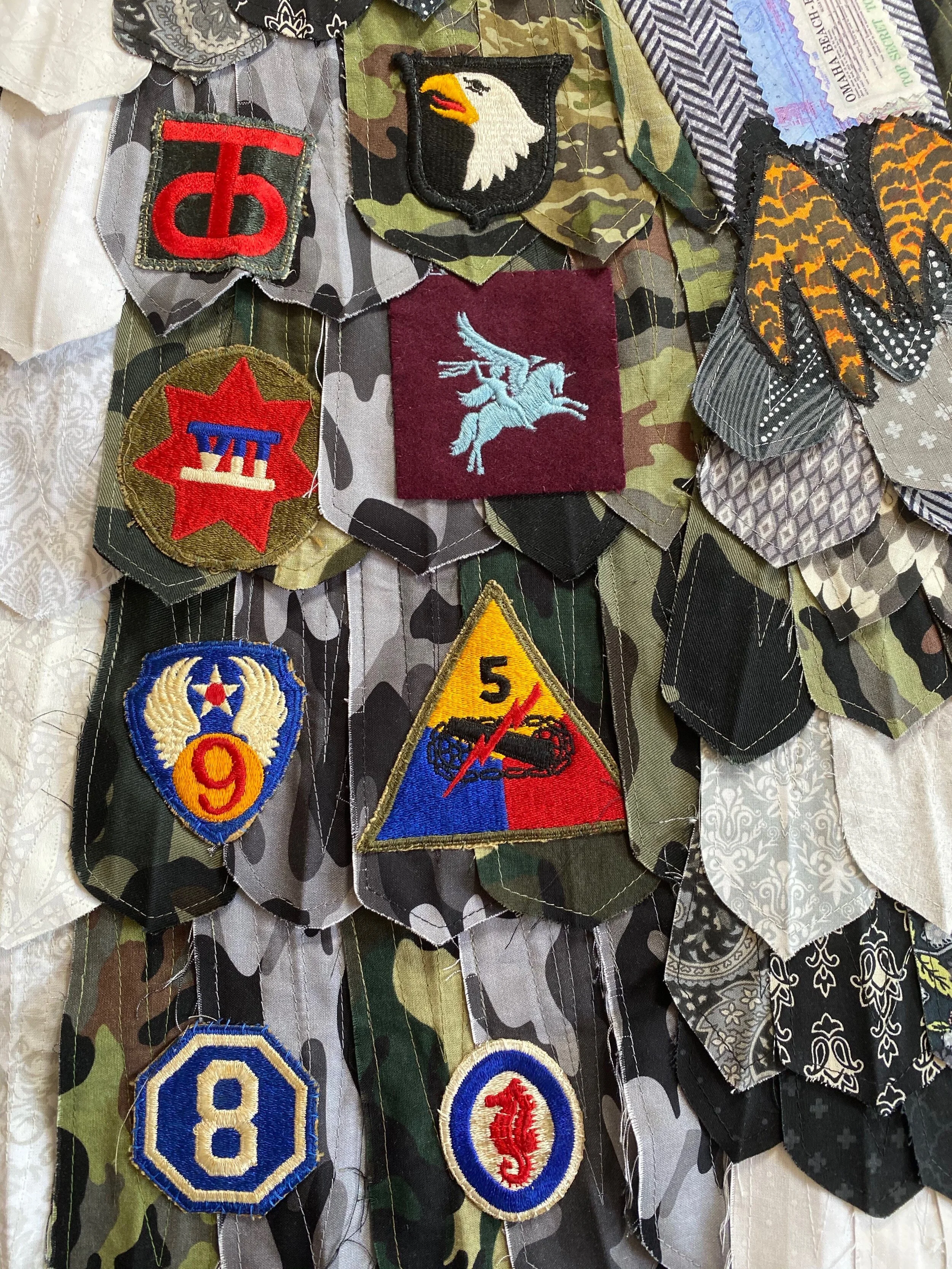 Omaha Beach incorporates the white and black invasion stripes of the Supermarine Spitfire warplane, a vintage map of the Omaha Beach landing site, and authentic antique military patches of the Normandy landing forces.