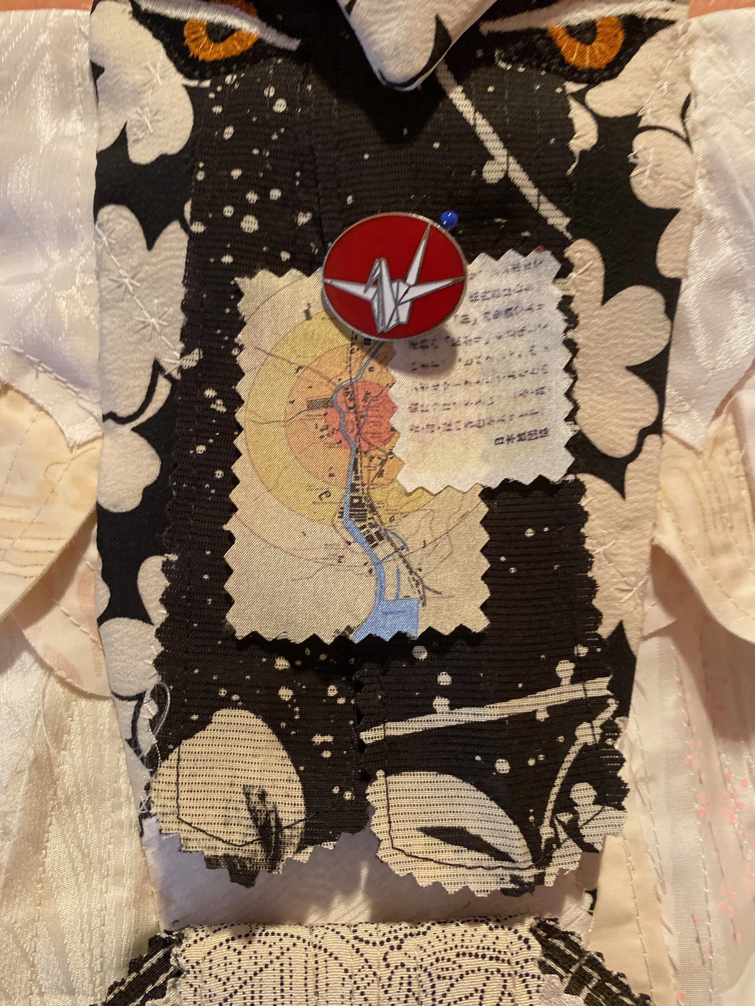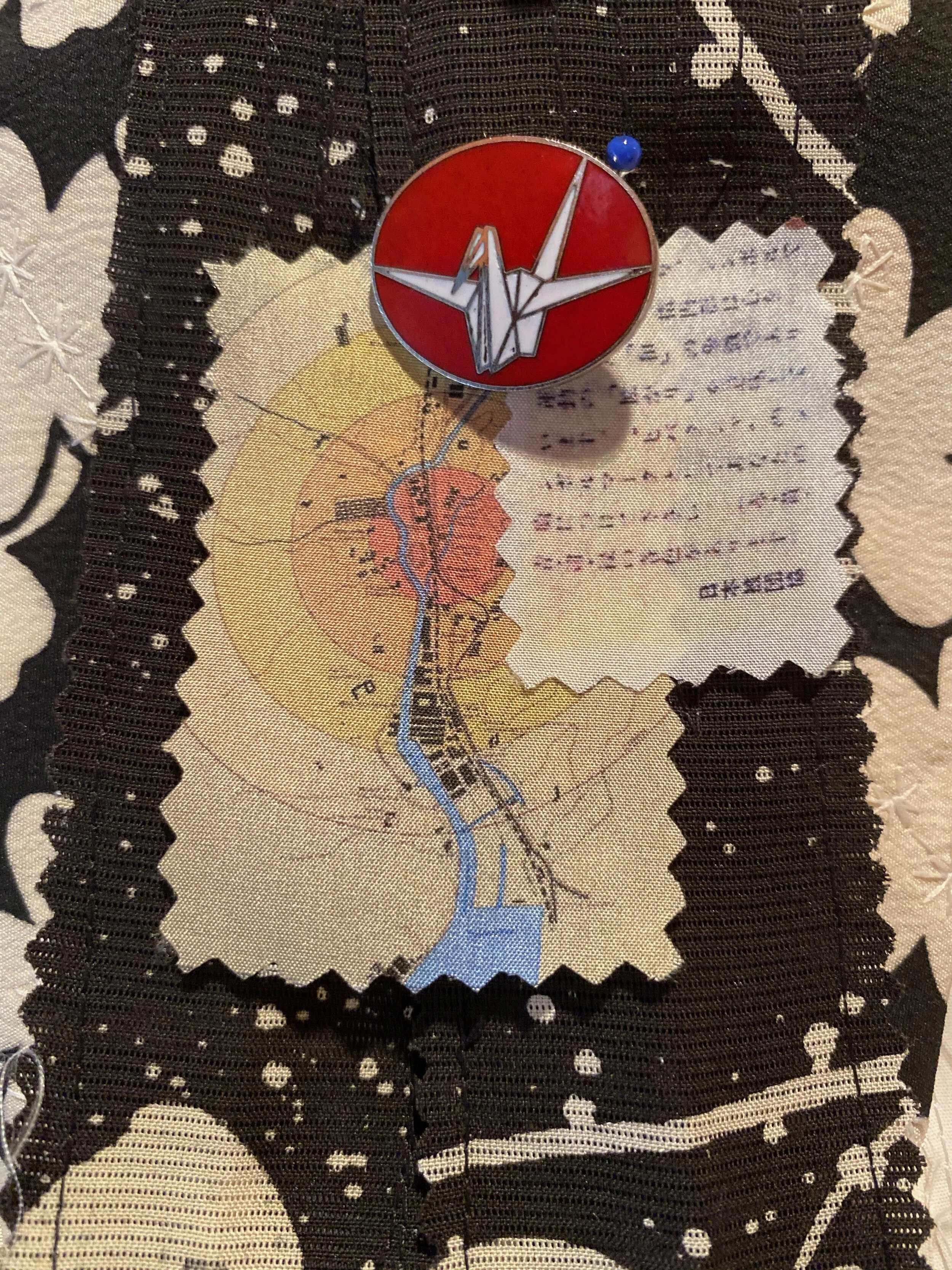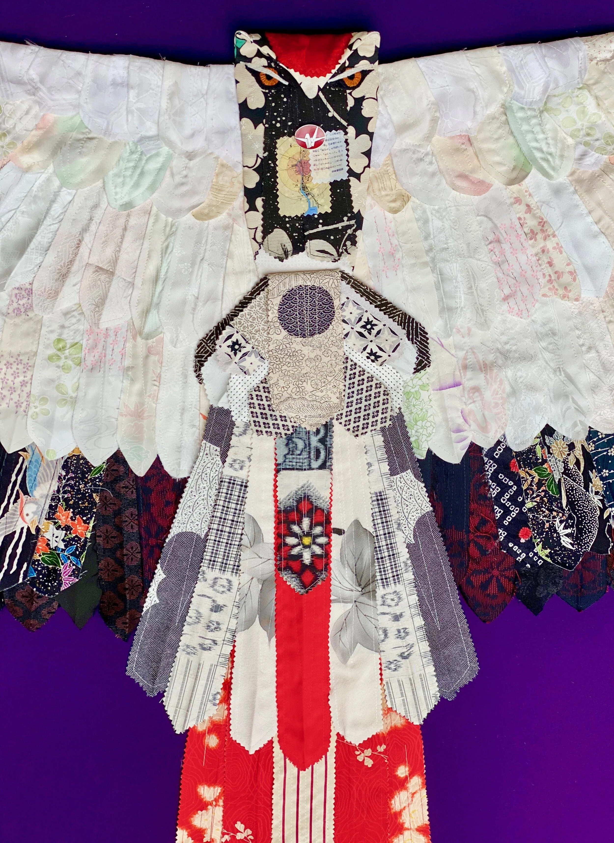 Soaring over the face of the earth, birds bear witness to both the insignificant and the incomprehensible events of human history. Nagasaki is fashioned after a red-crowned crane, a bird symbolizing immortality in Japan. The quilt is constructed from vintage Japanese silk kimono remnants, a silk-printed atomic bomb damage.map of Nagasaki, and a vintage “No More Hibakusha” (atomic bomb survivors) nuclear war protest pin in the shape of a crane.