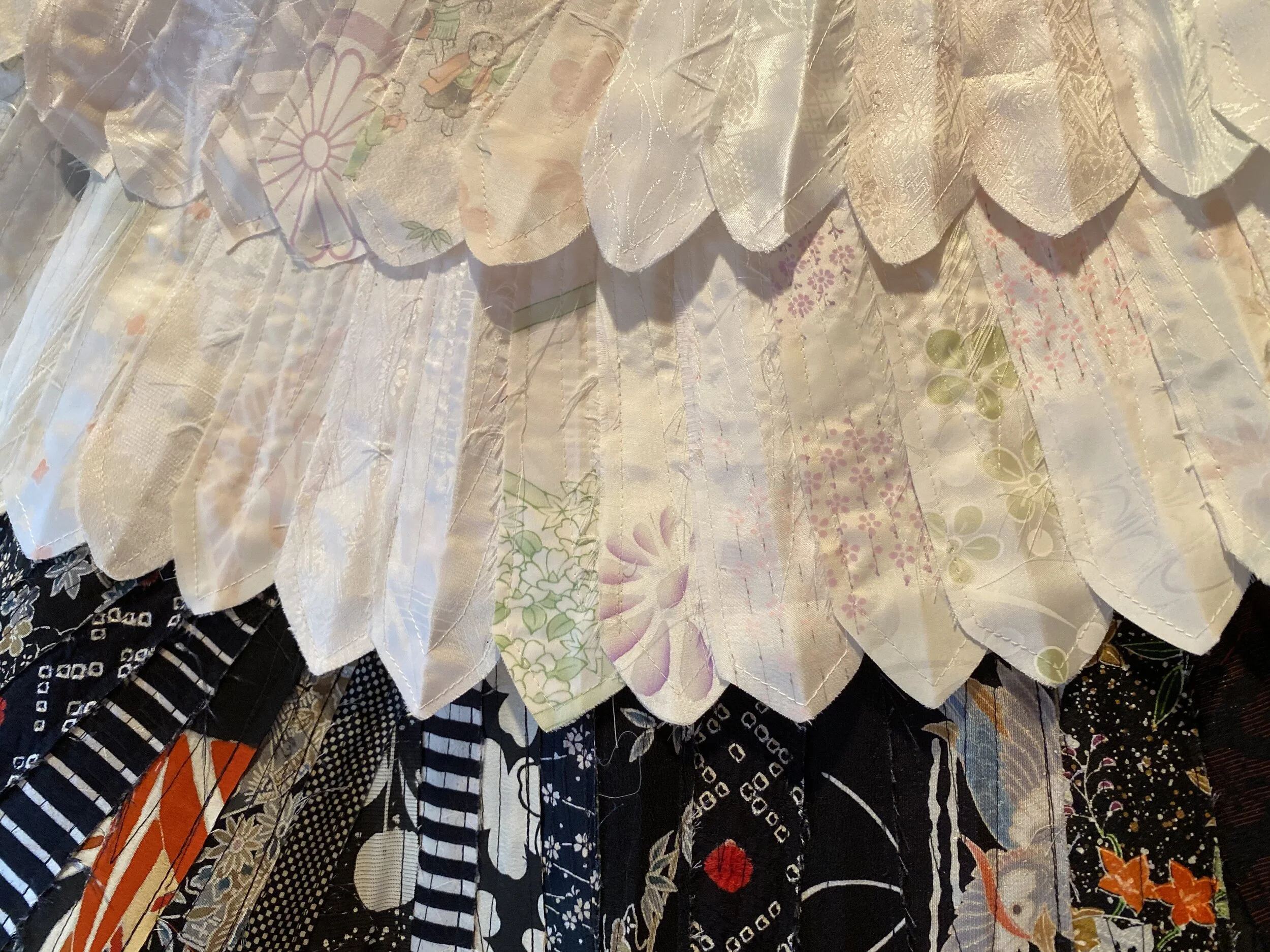 Bird feathers constructed from vintage silk kimono remnants.